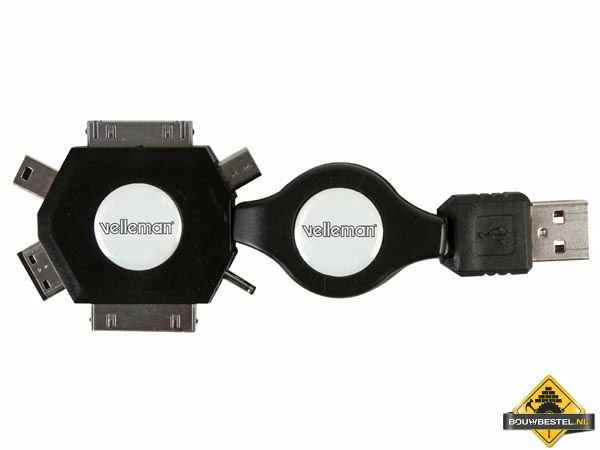 6-In-1 Zelfoprollende Usb 2.0-Laadkabel – Mannelijk/Mannelijk – Zwart – 53 cm