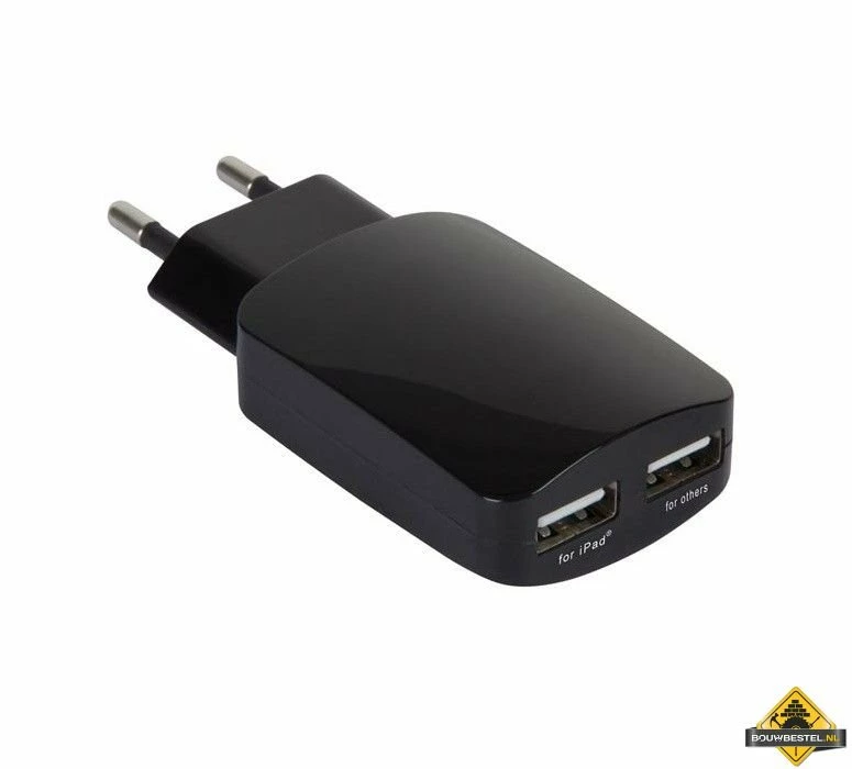 Compacte lader voorzien van 2 USB-aansluitingen.
