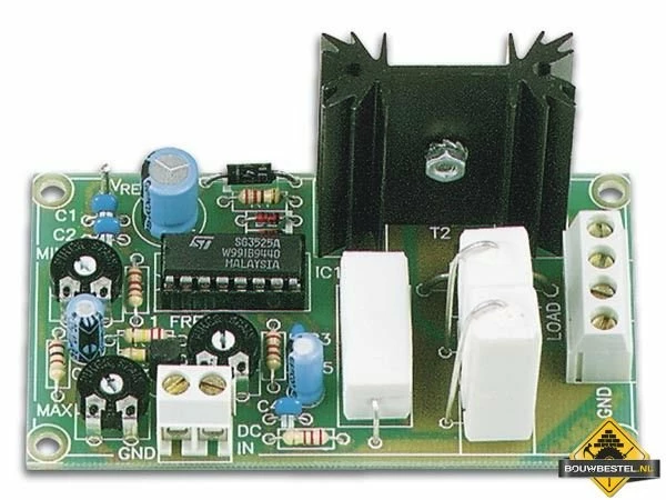 Deze schakeling is uitstekend geschikt voor de nauwkeurige regeling van een gelijkstroommotor, de lichtsterkte van een lamp, een kleine verwarmingsweerstand of andere gelijkaardige toepassingen. Deze schakeling zet een gelijkspanning om naar een opeenvolging van pulsen. De waarde van de gelijkspanning is daarbij recht evenredig met de duur van de puls. Het grote voordeel van een dergelijke schakeling is dat er bijna geen vermogen verloren gaat in het regelcircuit. Beveiligd tegen overbelasting en kortsluiting.