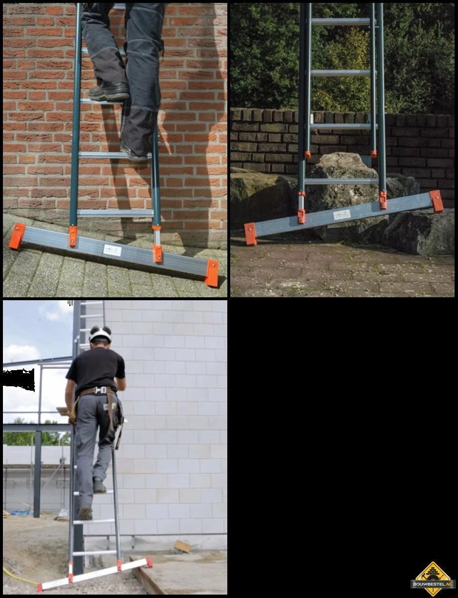 Ladder voor professioneel gebruik. Tot een hoogteverschil van 19 cm waterpas te stellen. Uitvoering: Poedercoating. Sportafstand 28 cm. Antislip sporten. Eenvoudig uitschuifbaar door automatisch vergrendelde schommelhaak. Inclusief stabilisatie balk en toprollen.