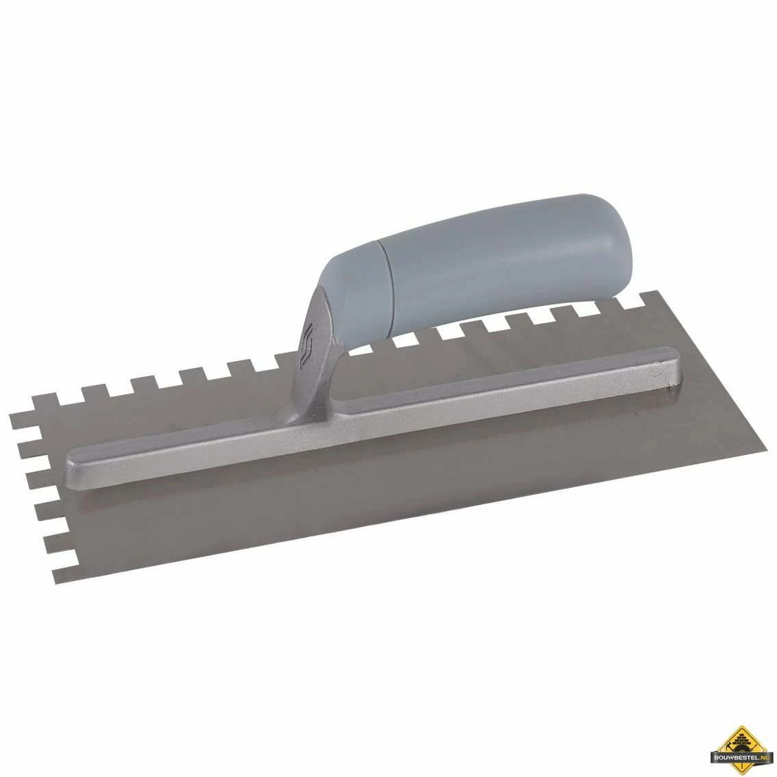 Lijmspaan met kunststof handgreep voor het verlijmen van tegels. Voorzien van een RVS blad, sterke en lichtgewicht aluminium ang.