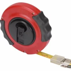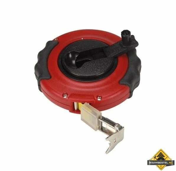 Stevig meetlint van 20 meter lang. Het meetlint heeft een stalen band en een gesloten kast.