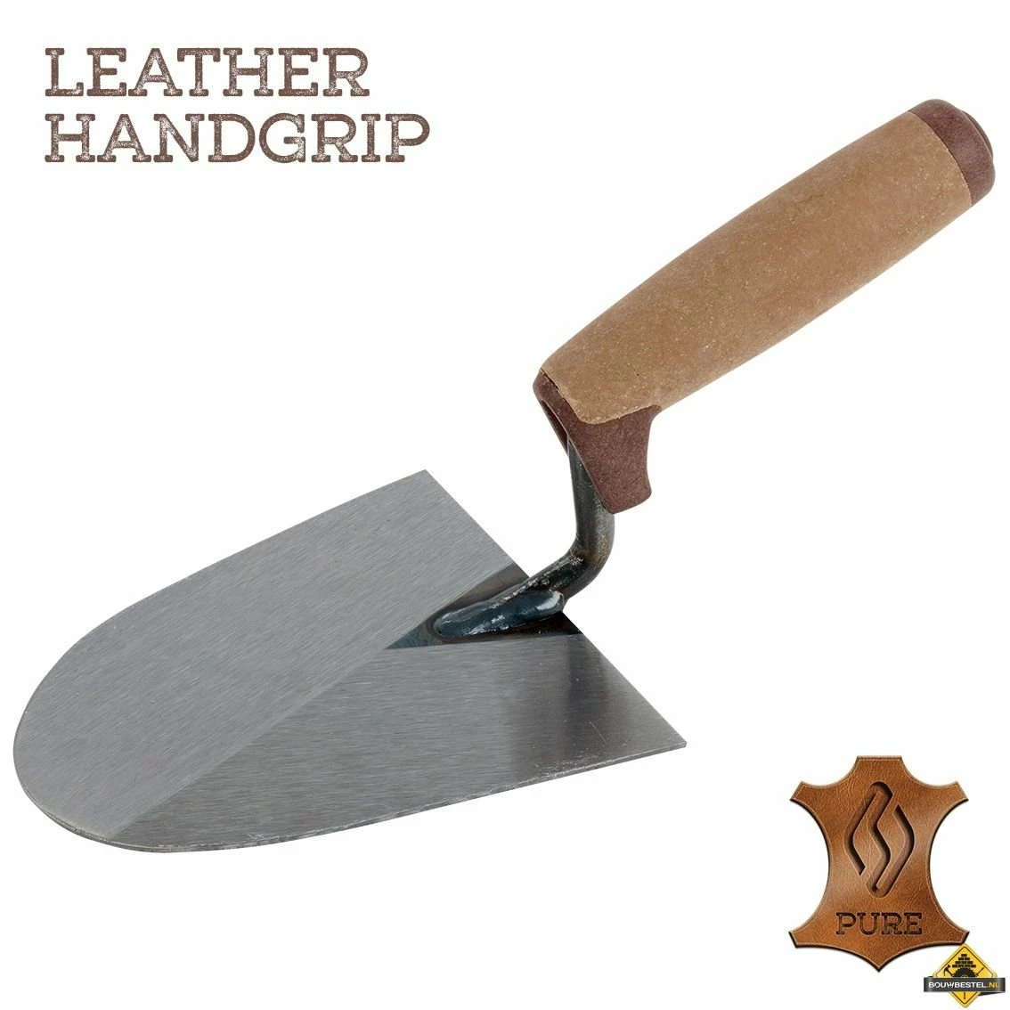 De Super Prof Pure metseltroffel ”rechts” is voorzien van een ergonomische lederen handgreep met vingerbescherming, welke een goede grip geeft en het vocht beter opneemt. Hierdoor wordt het werkcomfort en de productiviteit bevordert. De sterke vol verlaste verbinding, tussen de ang en het robuuste stalen blad met een aangescherpte kant, garandeert een zeer hechte en duurzame verbinding. Doordat het blad een geschuurd oppervlak heeft blijft het materiaal beter op de metseltroffel liggen.