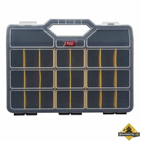 Deze handige TAYG sorteerkoffer heeft uitneembare compartimenten en een transparant deksel. Ideaal om kleine accessoires in op te bergen. De sorteerdoos is voorzien van een handvat en twee stevige kunststof sluitingen.